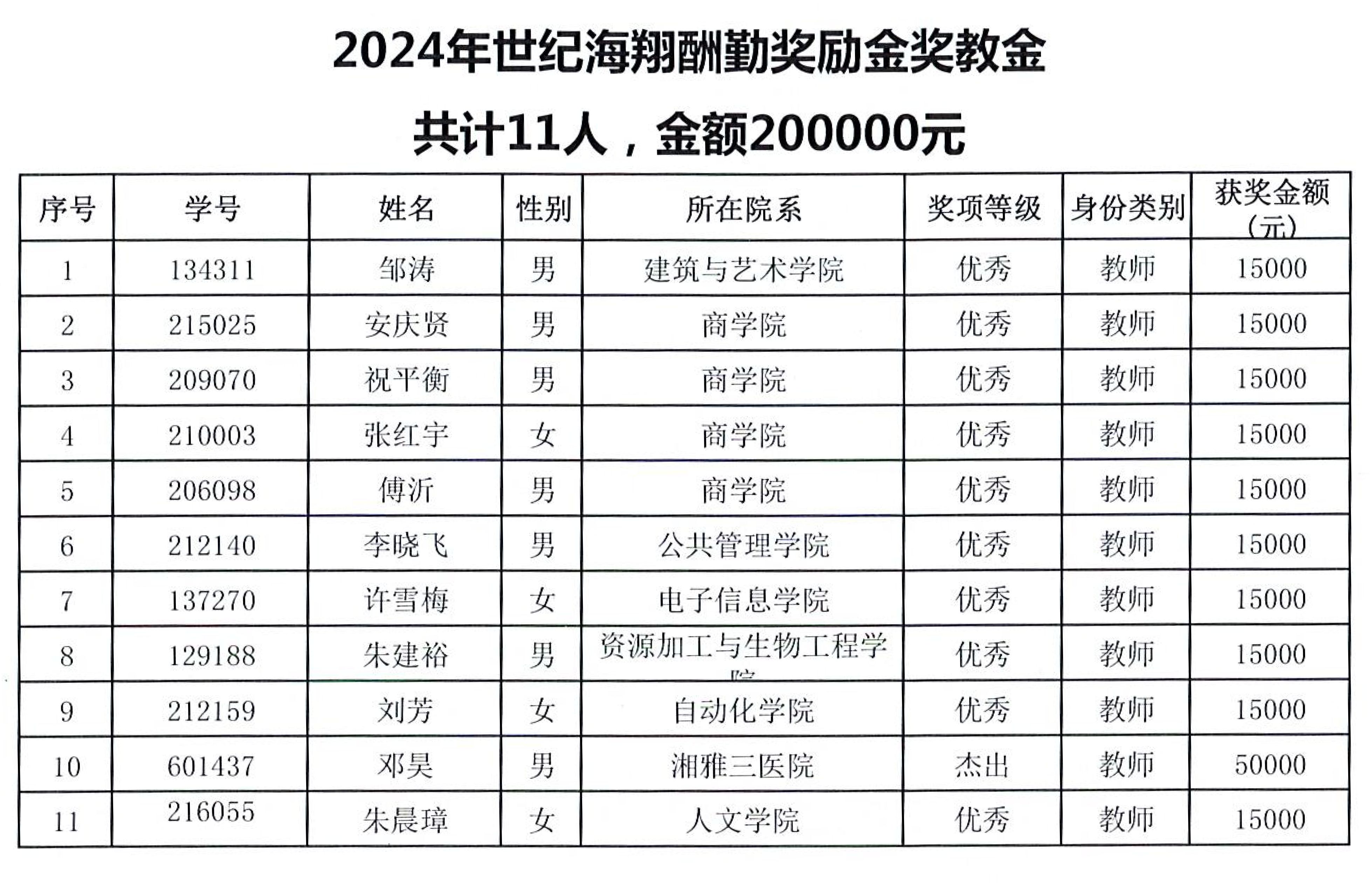 中南大學2024年度世紀海翔酬勤獎勵金獎教金評選結果