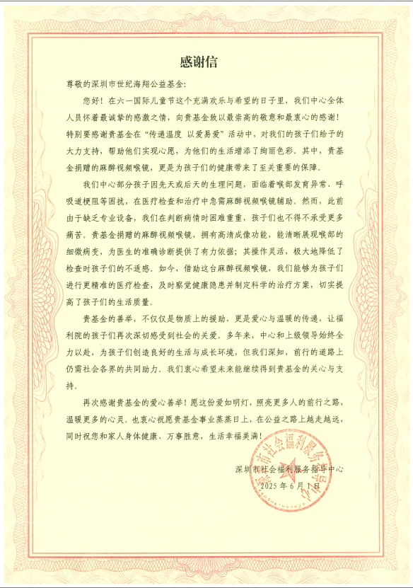 在六一國際兒童節這個充滿童真與希望的日子里,海翔公益基金會向深圳社會福利中心捐贈一臺可視喉鏡,這份特別的“健康禮物”助力解決部分喉部發育異常兒童的精準醫療檢查難題,為孩子們的健康成長保駕護航。