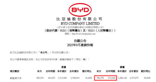 10月1日,比亞迪發(fā)布的產(chǎn)銷數(shù)據(jù)顯示,9月新能源汽車銷量為39.63萬輛,同比下降5.52%。