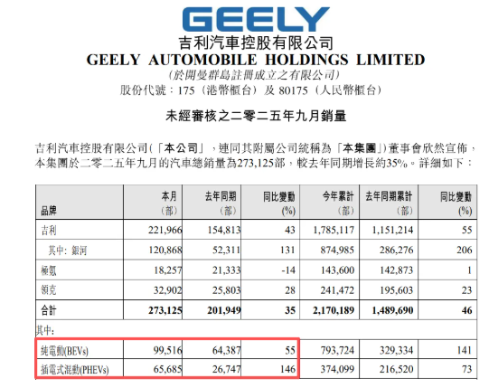 吉利9月銷量達27.31萬輛,同比增長35%,其中新能源銷量達16.52萬輛,同比增長81.27%,環(huán)比增長12.12%。