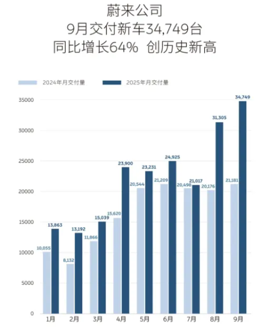 9月,蔚來的交付量再創(chuàng)新高,達3.47萬輛,同比增長64.06%,環(huán)比增長11%。