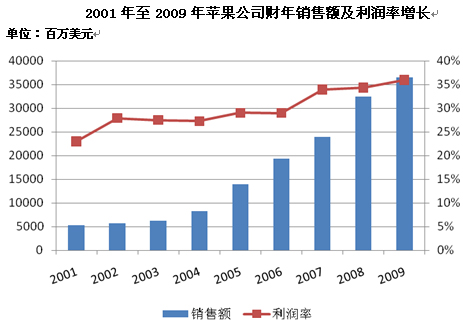 在2009年金融風暴后業界一片慘淡中,蘋果公司穩居福布斯全球高績效公司(Global High Performers)榜單。回顧本世紀第一個10年,總裁喬布斯重返公司后,蘋果公司借力幾款明星產品銷售額迅速增長,終于走出了其90年代經歷的低谷,公司利潤率持續處于行業內高水平。