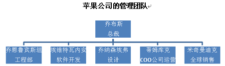喬布斯推崇小型的“A級工作組”,由精選的設計師、程序員和管理人員組成的“A級小組”,力圖組織人員建立只擁有“A級”參與者目標的共識。總裁喬布斯追求其領導下的組織機構簡單直接。不同于大多數公司隨著規模擴大而雇傭越來越多的工程師、設計師,變得越來越繁復的官僚機構,蘋果公司核心部分一直保持由最優秀的成員組成的較小的規模。來到蘋果公司的人才得到了有效的激勵和創作空間,同時喬布斯會扮演小組指揮員的角色在工作小組努力工作、尋找解決方案的過程中指導合作。最優秀人員來到蘋果公司后都會擁有大額的股票期權,同時會被充分給予發揮自己創造力的自由,不被官僚氣氛妨礙。喬布斯雖然對蘋果公司的各業務親力親為,但是他喜歡用爭論和辯論的方式在團體工作的環境中開拓創造性思維。