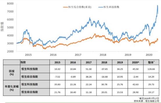新指數(shù)將會(huì)追蹤經(jīng)篩選后30間市值最高的、于香港上市的科技企業(yè)。根據(jù)回溯測(cè)試計(jì)算數(shù)據(jù),恒生科技指數(shù)于 2019 年全年及 2020 年以來的回報(bào)分別高達(dá) 36.25% 45.5%
